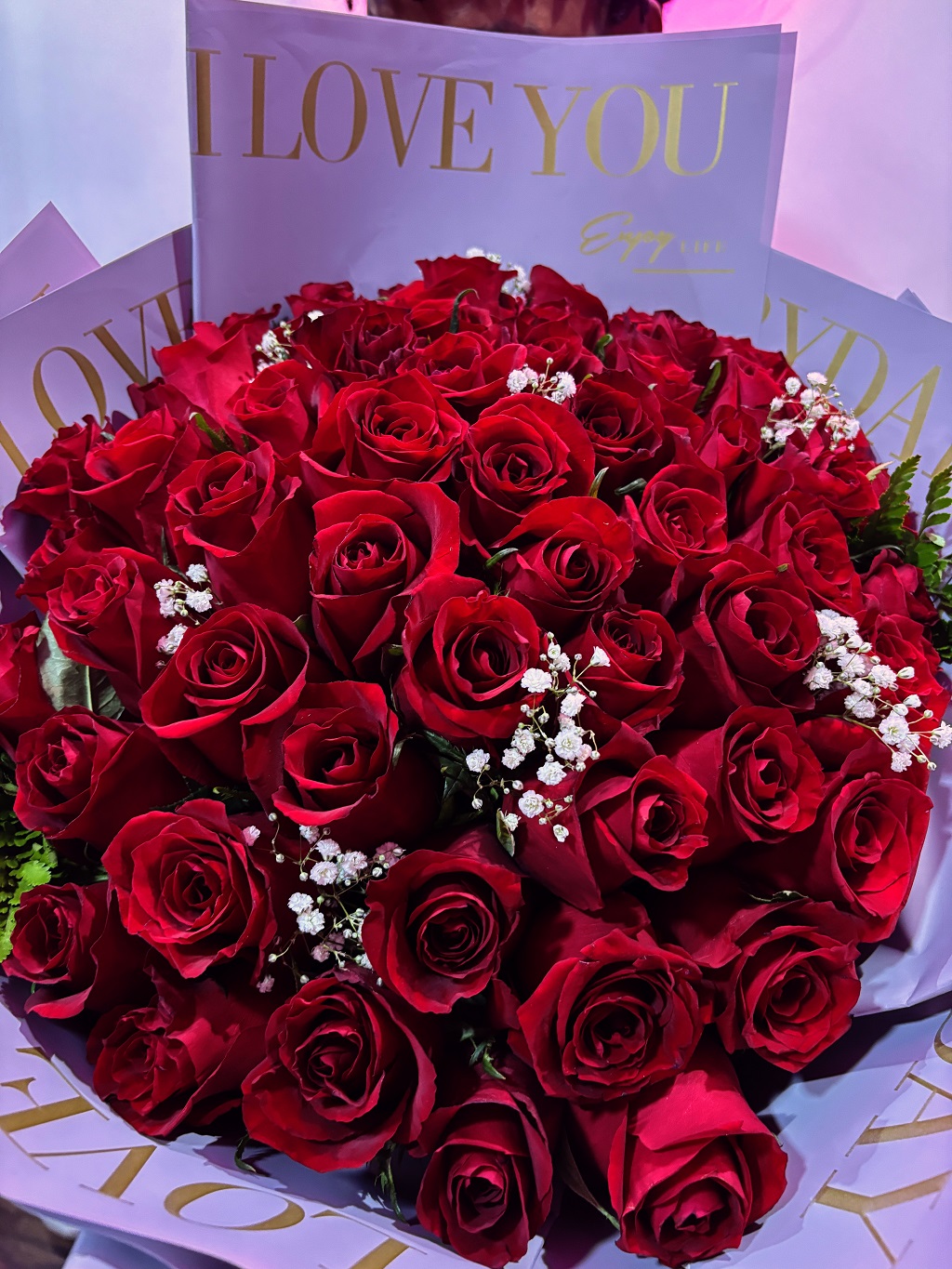 50 stems of roses with sprinkle of fillers, wrapped with the utmost care & and love