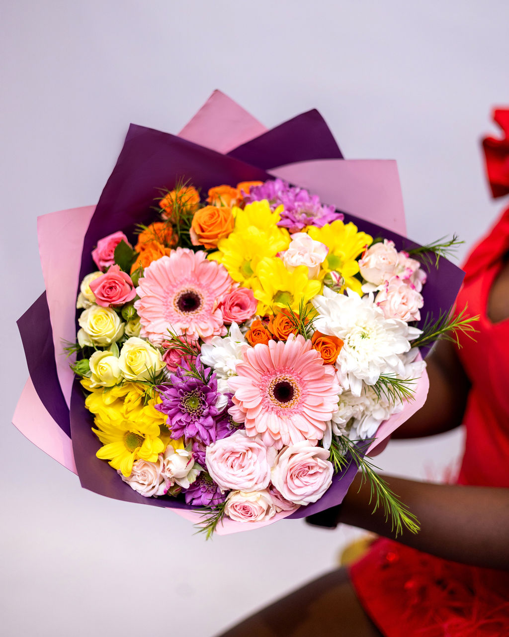 A Beautiful mix of exotic resh flowers comprising of spray roses, sweet gerberas & chrysanthemums