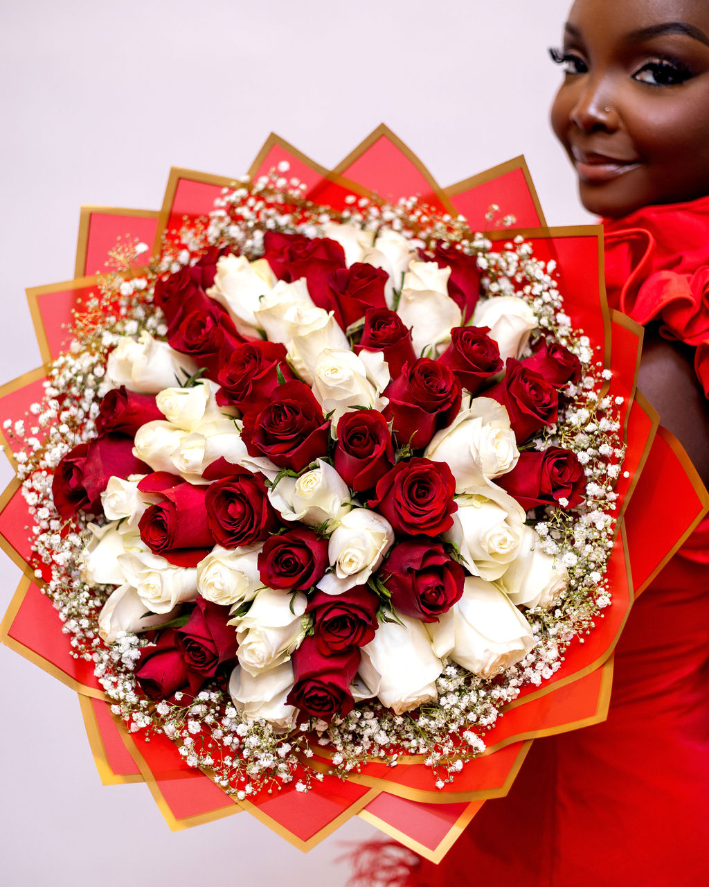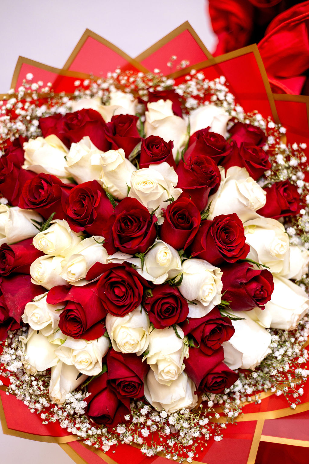 A combo o 50 red & white rose with snow breathes crown, wrapped with love