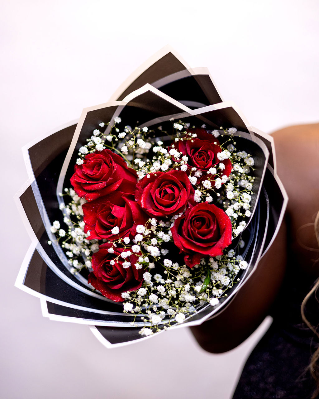 6 red roses and snow breathes, wrapped with love